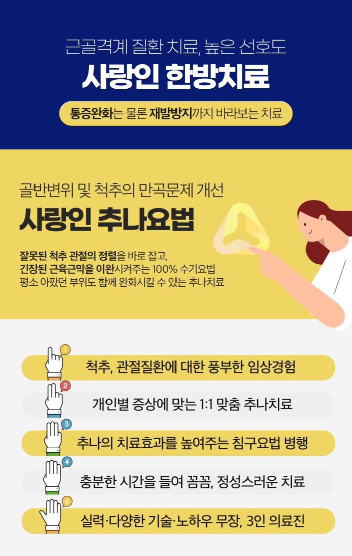 추나요법을 진행하게 될 땐 척추 질환 그리고 관절 질환으로 많은 치료 경험을 갖추며 숙련된 의료진이 진행하여 신뢰를 받아볼 수도 있을 것인데요. 더불어 추나요법을 진행할 때 환자분들에게 일관적으로 진행하는게 아닌 개별적으로 진행하게 된답니다. 이때 충분한 시간을 가지면서 꼼꼼하고 정성스러운 치료에 도움을 드리고 있습니다.
