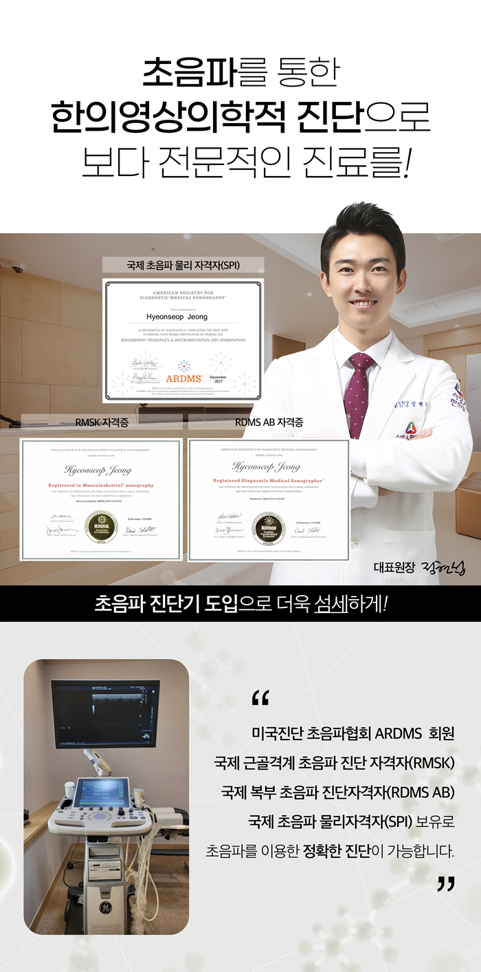 지금 건강 상태에 대해 걱정하고 계신다면 체질, 신체 상태, 증상 등을 꼼꼼하게 진단받을 수 있습니다. 다년간의 임상 경험과 끊임없는 연구를 통해 축적된 노하우와 지식을 바탕으로 숙련된 의료진이 신체 상태를 정확하게 파악하고 있습니다. 따라서 편안한 분위기에서 진료에 집중하여 건강을 되찾으실 수 있도록 최선을 다하겠습니다.