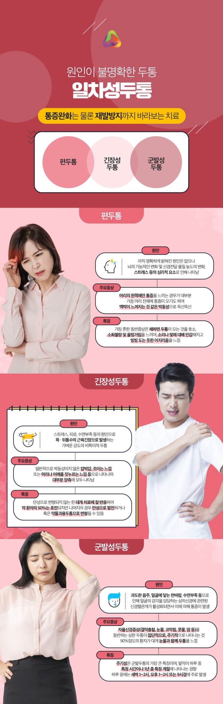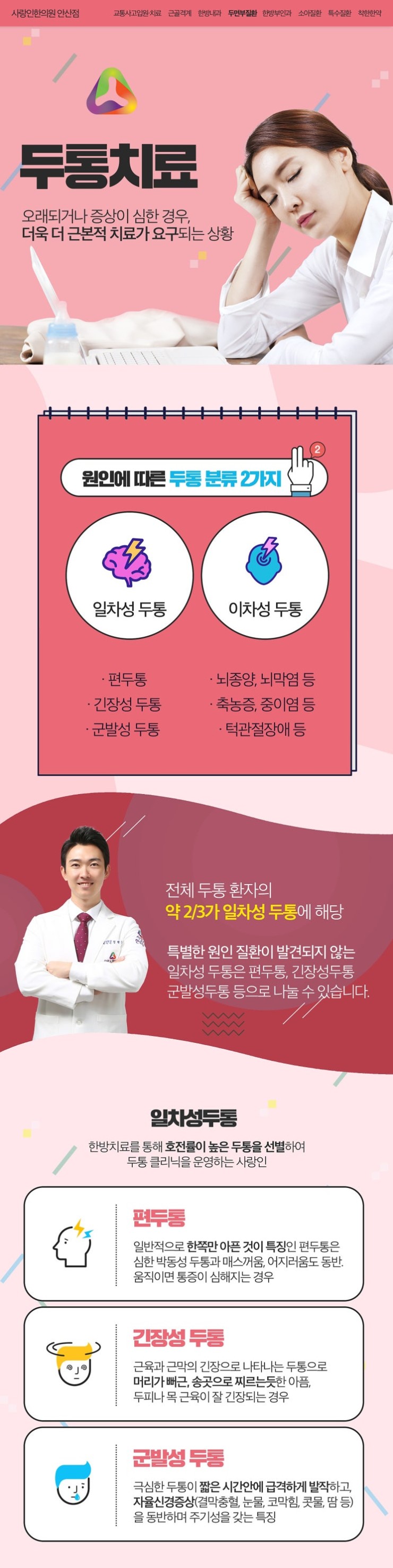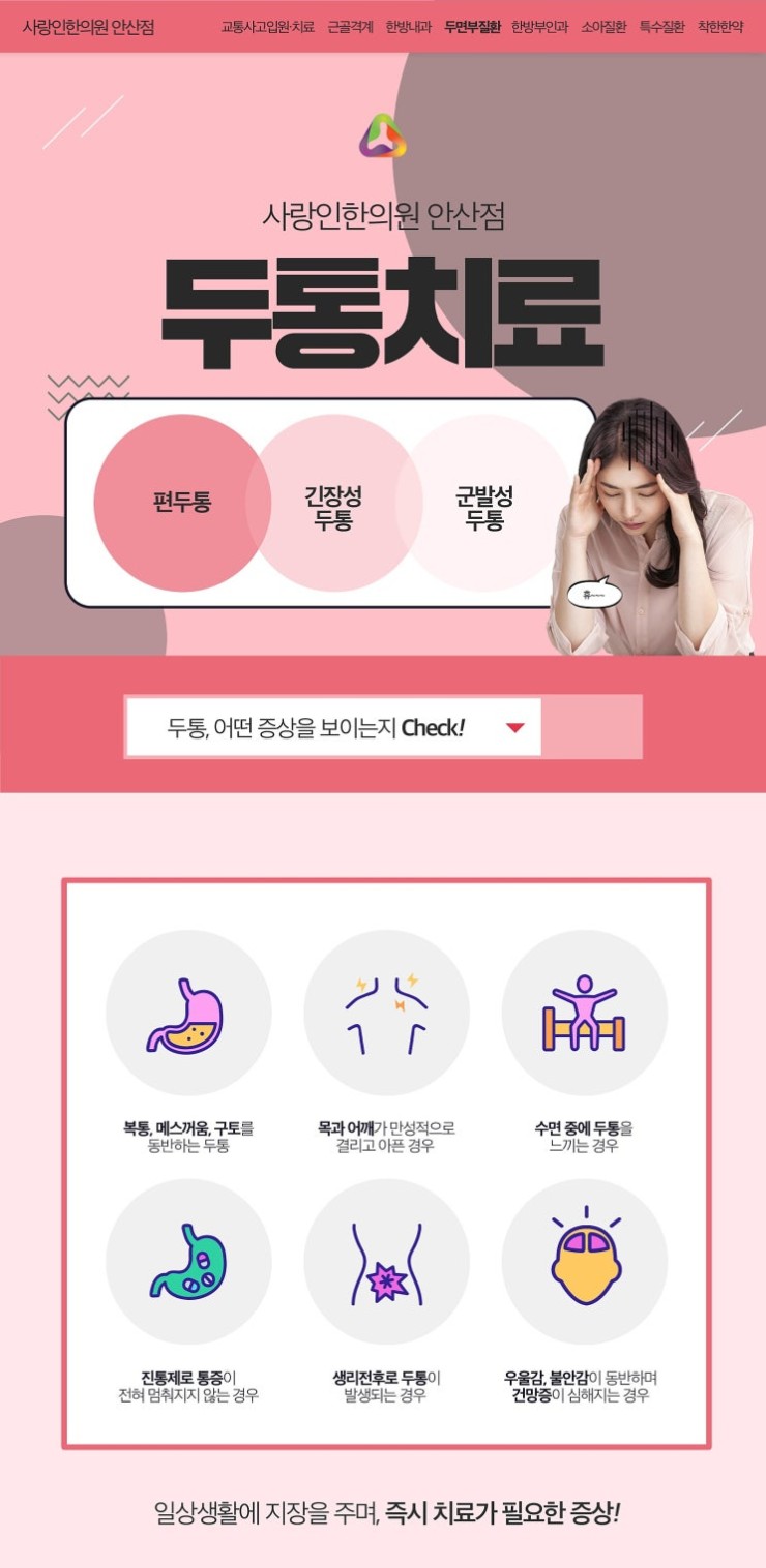 전체 두통 환자분들의 2/3 정도는 일차성인 두통을 호소하십니다. 이런 상황일 때 특별한 원인의 질환이 발견되지 않아서 어떻게 관리해주어야 할지 환자분들이 답답함이 커질 수 있을 것이라 생각합니다. 본 한의원과 함께 하면 답답함을 개선해볼 수도 있는데 빠르게 건강 호전을 해볼 수 있는 장점도 있으니 참고를 해주세요. 편두통은 보통 한쪽만 아픈게 특징인데 움직이면 통증이 심해지는 경우가 많이 있습니다. 군발성 두통은 극심한 두통이 짧은 시간으로 급격하게 발작하는 특징을 가지며 결막충혈, 콧물, 코막힘, 눈물 등의 증상이 함께 발생하는 경우도 많습니다. 두피와 목 근육이 평소에 잘 긴장하는 분들은 긴장성 두통으로 쉽게 보일 수도 있으니 참고해주세요. 평소 열심히 건강을 돌본다고 자부하시는 분들 중 이런 문제를 경험하시는 분들도 많으신데요. 대부분 스트레스라고 일시적으로 넘기기도 하지만 이제는 안산 편두통 한의원 한방 관리를 통해서 올바르게 케어해주어야 한다는 것을 알아주세요.
