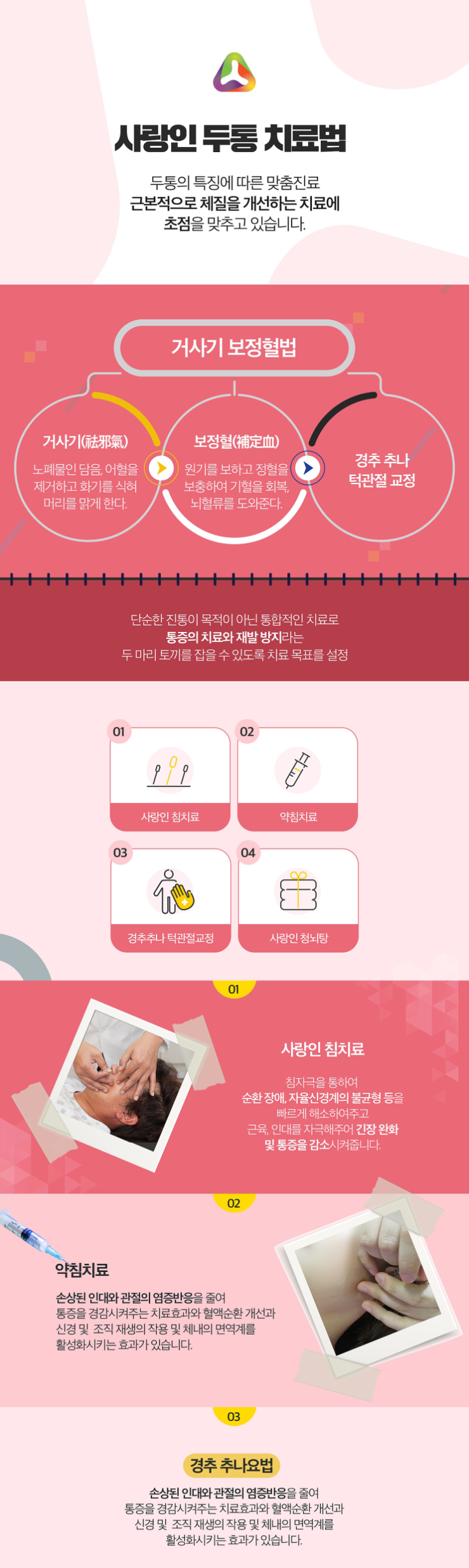 본 한의원에서는 근본적으로 체질을 개선할 안산 편두통 한의원 치료로 환자분들의 두통을 관리해드리고 있습니다. 그중에서 거사기 보정혈법을 사용하기도 합니다. 거사기는 노폐물인 담음 및 어혈을 제거해주고 화기를 식혀서 머리를 맑게 해준다고 생각할 수 있는데 보정혈은 원기를 보하며 정혈을 보충해서 기혈을 회복해 뇌혈류를 도와줄 수 있습니다. 경추와 턱관절 교정을 통해 통증을 치료하기도 하며 또한 재발 방지 효과도 볼 수 있어 일석이조의 효과를 누려보려는 분들이라면 주저하지 마시고 방문도 해보세요. 진료부터 치료까지 개별적으로 진행하여 환자분들이 꾸준하게 치료하는데 적극적으로 임한다면 얼마든 호전 효과를 만날 수도 있을 것입니다. 그래서 가끔 방문하거나 중간에 상태가 나아졌다는 이유로 치료를 그만둔다면 관리해주는 효과는 제대로 보기 어려울 수 있기에 하루 빨리 방문을 하여 꾸준한 한방요법을 통해 도움을 받아보세요.