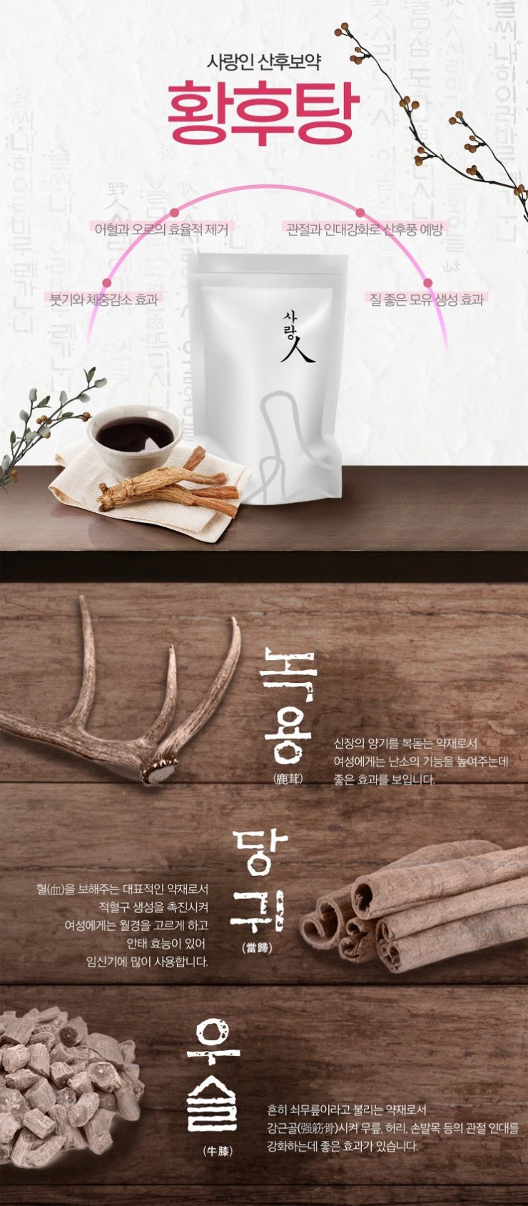 어혈과 오로 제거, 관절과 인대 강화로 산후풍을 예방하기 위한 안산 산후보약 도움도 받아보세요. 황후탕에는 녹용과 당귀 그리고 우슬이 들어가게 되는데요. 녹용은 난소의 기능을 높여보는 좋은 효과가 있으며 당귀는 안태 효능이 있어 임신기에 많이 사용합니다. 우슬은 무릎과 허리 그리고 손목 및 발목 등의 관절 강화에 효과가 있습니다.