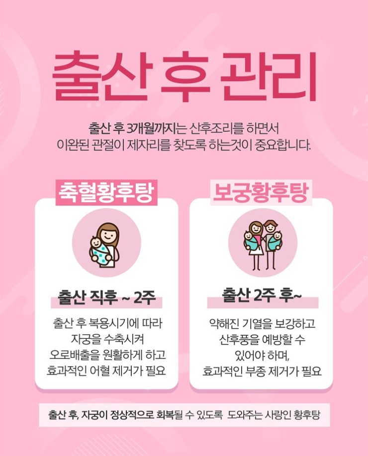 임신 중에 자궁이 커지고 출산에 가까워질수록 릴렉신이란 호르몬이 분비되어서 골반과 관절 등이 이완되는데요. 이러한 과정은 산모의 몸에 손상을 남길 수 있습니다. 출산 과정에 제대로 배출하지 못한 노폐물, 오로가 쌓여서 문제가 될 수 있습니다. 적절한 시기 관리를 해주지 않는다면 산후 후유증으로 남아서 고생할 수 있습니다.