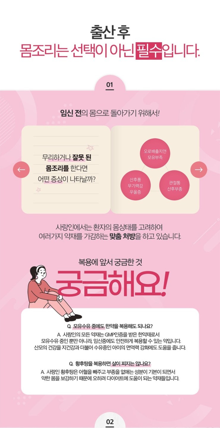 산후풍과 산후 우울증 등 후유증을 예방하기 위해서 도움도 받아보세요. 충분한 산후조리 과정을 거치지 않고서 무리한다면 오로배출 지연이나 모유부족 그리고 산후풍 및 무기력함, 관절통 등의 증상이 발생하게 됩니다. 무유수유 중이라도 복용할 수 있는데요. 수유중인 아이 면역력 강화에도 도움이 되는데요. 한약은 살이 찐다는 편견도 있으나 본원의 황후탕은 부종을 제거해주는 성분이 기본이 되어서 다이어트에 도움될 수 있기도 합니다.