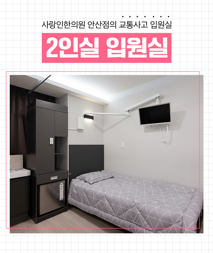 통원치료뿐만 아니라 입원치료도 제공합니다. 객실은 2인실로 구성되어 있으며 1인실과 같은 독립적인 공간에서 편안하고 쾌적하게 치료에 전념할 수 있습니다. 위생적이고 편안한 환경에서 빠른 회복을 경험해 보세요. 후유증을 방치하면 이차 질환이나 만성 질환으로 이어질 수 있으므로 안일하게 대처해서는 안 됩니다.
