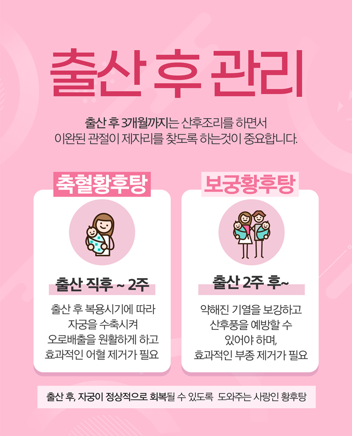 출산 후에는 꼼꼼하고 체계적인 관리를 통해 임신 이전의 건강한 상태로 회복하는 것이 무엇보다 중요합니다. 하지만 많은 산모님들께서 육아와 가사에 지쳐 자신의 건강을 돌볼 겨를 없이 힘든 시간을 보내고 계시는 것이 현실입니다.
