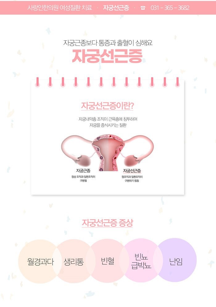 자궁선근종으로 방문을 해주시는 경우도 있습니다. 이런 자궁선근증을 겪고 있을 땐 월경 과다, 생리통, 빈혈, 빈뇨, 급박뇨, 난임으로 생길 수 있는데요.