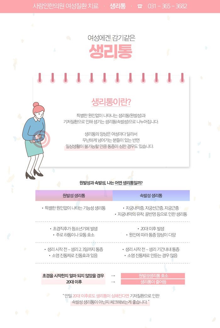 생리통이 심해 찾아주시는 경우도 많은데요. 생리통은 특별한 원인 없이 발생하는데 원발성 생리통, 기저질환으로 생기는 속발성 생리통으로 구분할 수 있습니다.