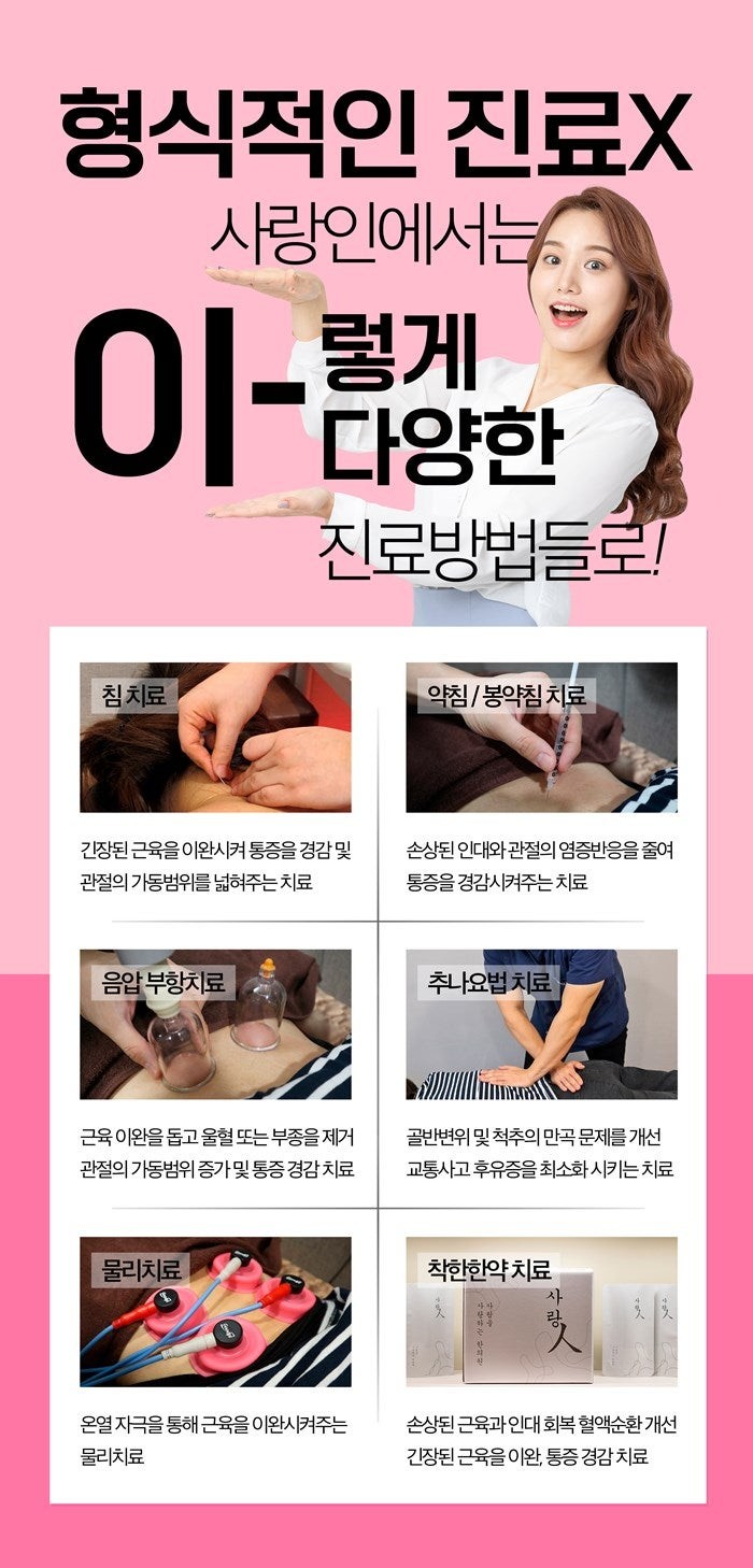 이런 경우 안산교통사고한의원 방문을 해보시게 될 땐 형식적으로 진료를 하지 않고 환자분들이 통원 치료를 받는게 적합할지 또는 입원 치료로 진행하는게 적합할 수 있을지 결정하는데요. 이런 침구요법에는 침치료부터 약침 그리고 봉약침 치료와 음압 부항치료, 추나요법 치료, 물리치료, 착한 한약 치료가 있습니다.