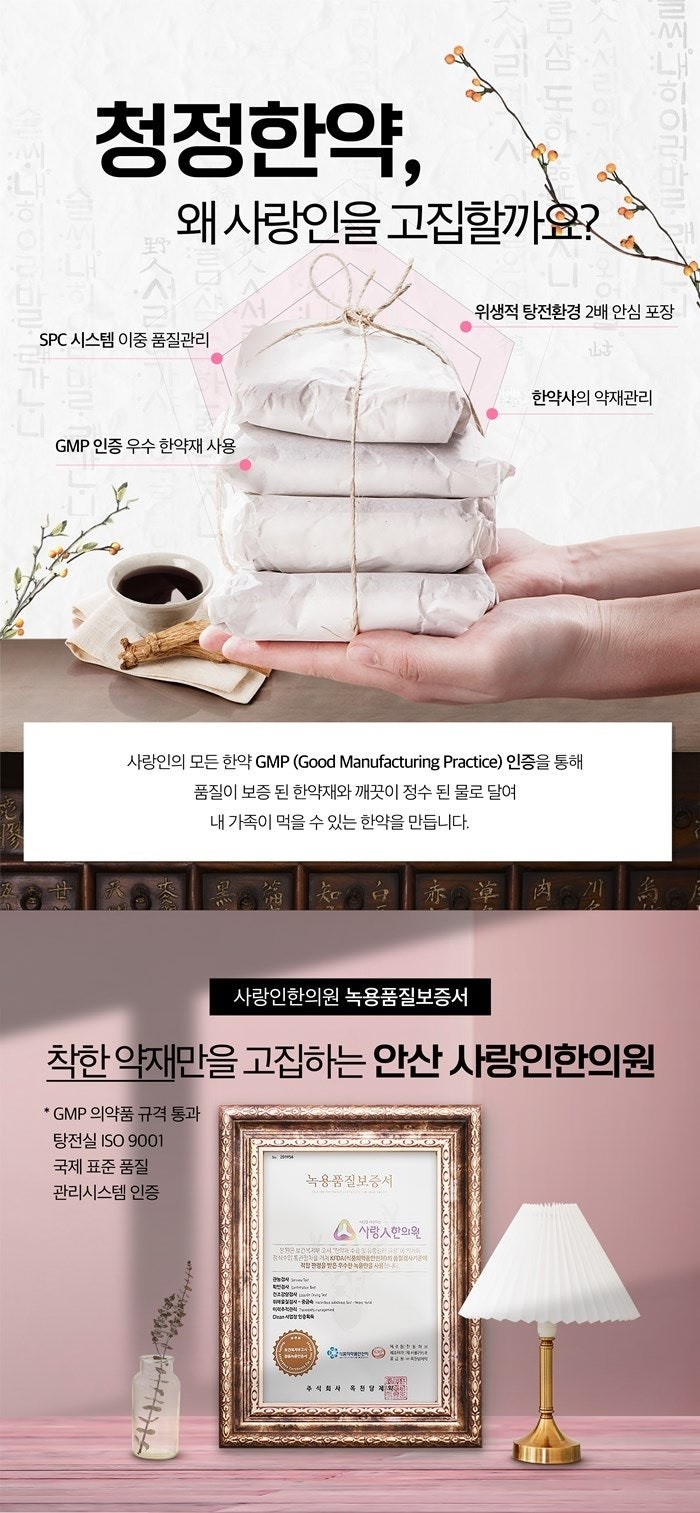 이러한 본원의 한약 처방 시 SPC 시스템으로 이중 품질 관리를 진행하고 위생적인 탕전 환경에서 두배 안심 포장이 이루어지는데요. 또한 GMP 인증을 받은 한약재로 사용하고 있습니다.