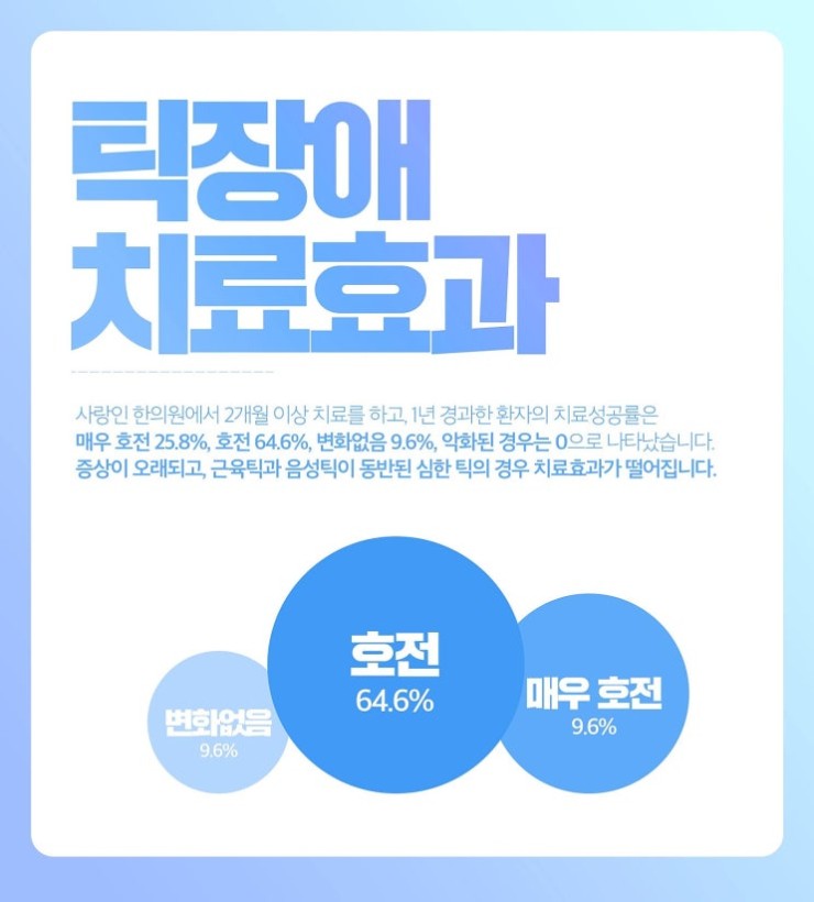 발병 3개월 이내는 2~3개월 만에 그리고 발병 1년 이내일 경우 6개월만에 개선되어가는 것을 확인할 수 있어 가급적 치료 시기를 놓치지 않게 하며 신뢰하고 아이들이 좋아하는 한의원에서 틱장애 치료로 받아보시길 바랍니다.