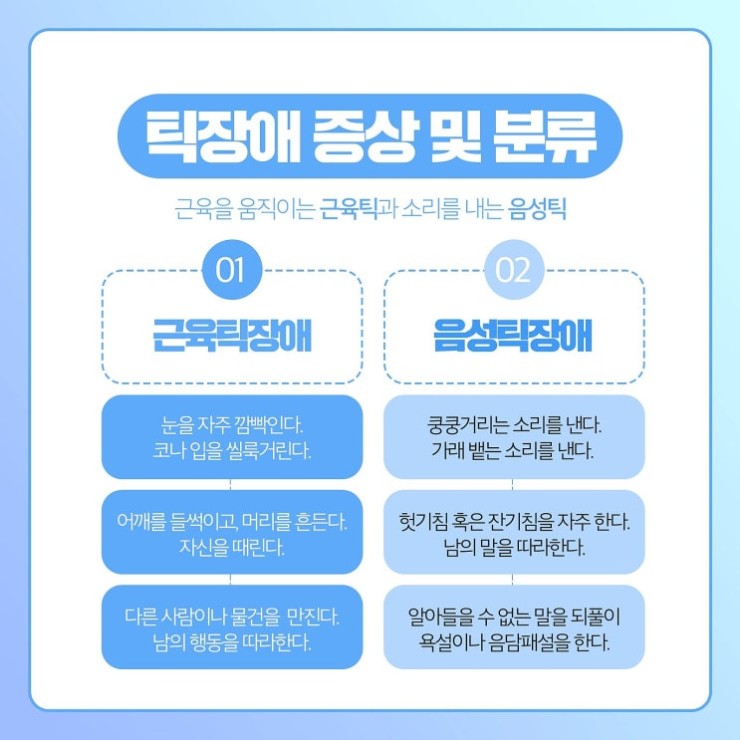 부모님께서는 자녀가 하는 행동을 관심있게 지켜볼 텐데요. 혹시 아이가 반복적인 행동을 하지 않았는지, 자기 의지와 상관없이 근육 움직임이 있지는 않은지, 의도하지 않은 소리나 말을 하지는 않는지 살펴보는 것이 부모님의 마음일 것이랍니다.