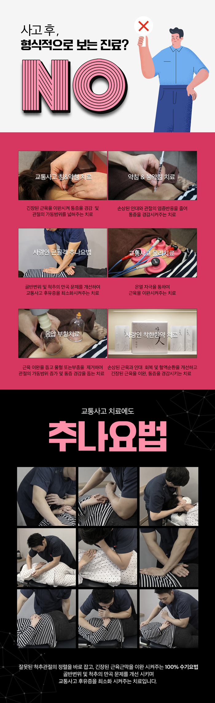 어혈이 뭉친 부위에 적용하여 어혈을 피부 표면으로 유도하고 배출을 돕습니다. 추나요법은 신체의 일부, 보조 도구를 사용하여 틀어진 구조를 교정하는 수기 요법입니다. 추나요법은 틀어진 구조를 바로잡아 어혈이 잘 순환될 수 있는 환경을 조성하고 후유증을 최소화합니다.