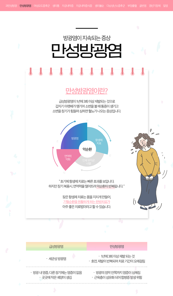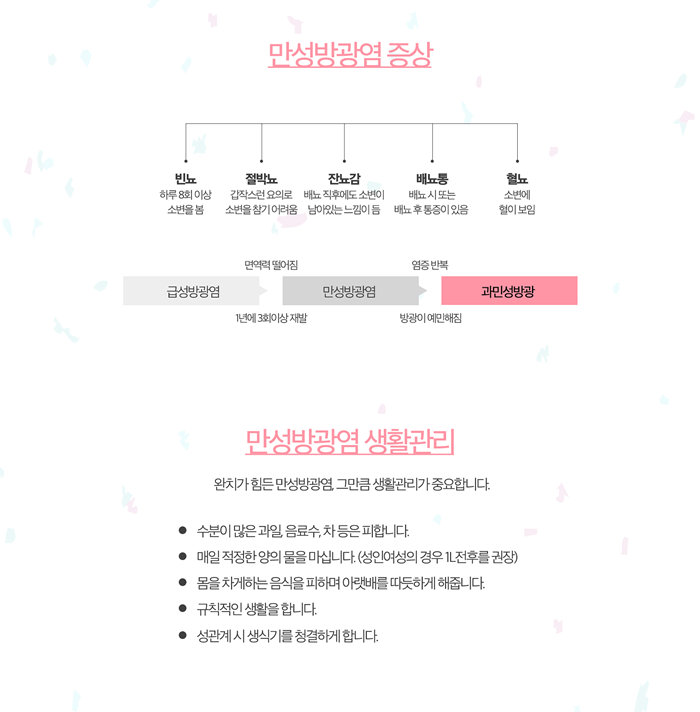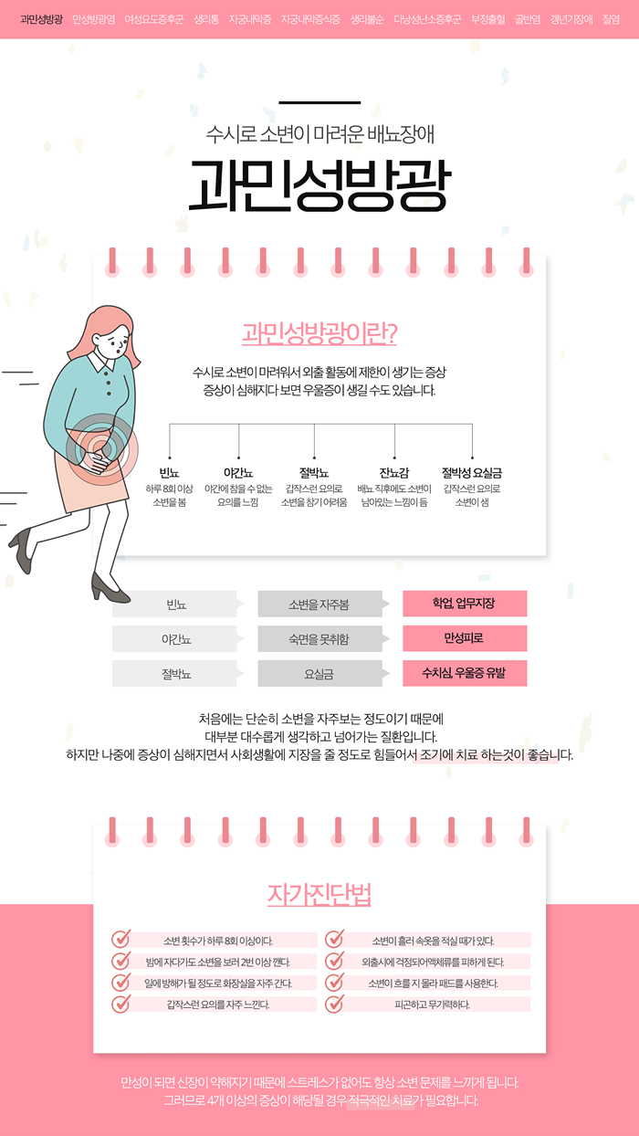 생명을 위협하는 질환은 아니지만 생활하는데 있어 불편함을 줍니다. 초기에는 증상이 경미하여 대수롭지 않게 생각하고 방치하기 쉽습니다. 하지만 시간이 지나면서 방광 근육의 과민성이 더욱 심해지고 잘못된 배뇨 습관이 굳어지면서 증상이 악화되는 경우가 많습니다.