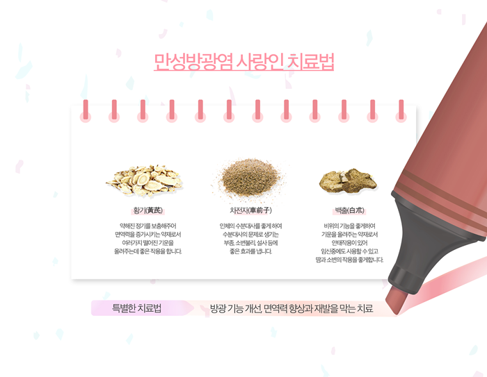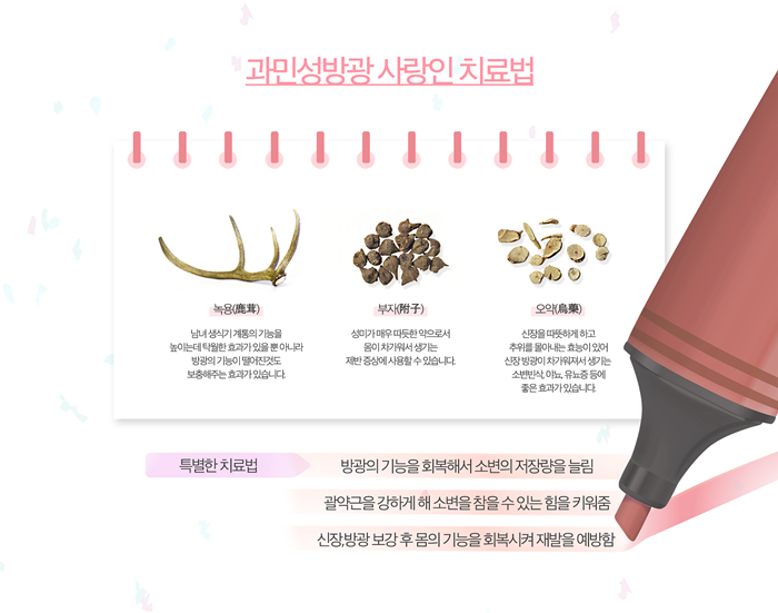 한의학에서는 인체 전반의 불균형, 신장과 방광을 포함한 기능 약화, 하복부 냉증, 스트레스 등 다양한 원인이 복합적으로 작용한 결과로 봅니다. 한약치료를 통해 방광의 기능을 회복시키고 소변 저장 용량을 늘리는 데 중점을 둡니다. 소변을 참는 힘을 담당하는 괄약근 기능을 보강하고 신장과 방광의 기능을 튼튼하게 하여 비뇨기계 건강을 회복하고 증상 재발을 예방합니다.