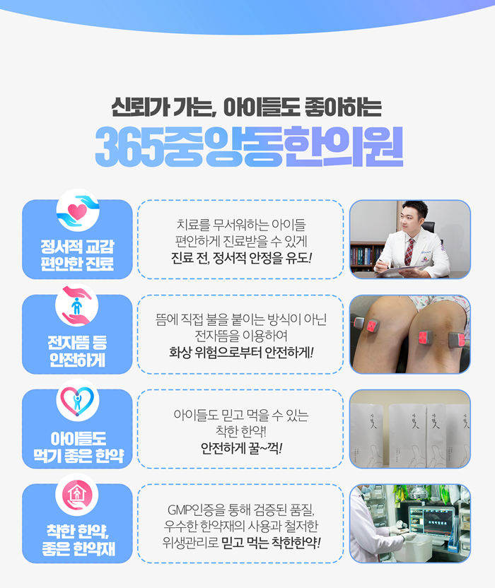 증상이 점차 호전되고 안정화되면 주 1회로 내원 횟수를 줄여 유지 관리에 들어갑니다. 틱장애의 원인인 뇌 기능의 불균형과 심리적 불안정을 개선하기 위해 한방치료법들을 복합적으로 적용합니다.