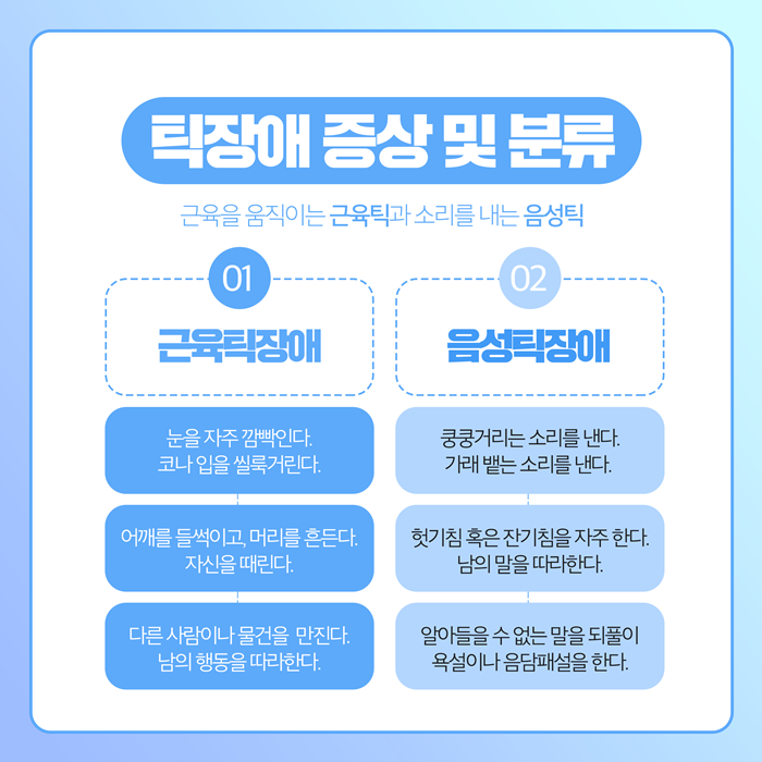 음성틱장애는 호흡기나 발성 기관을 통해 소리를 내는 것을 말합니다. 의미 없는 단어나 구절을 반복하거나 다른 사람의 말을 따라 하는 음성 틱으로 발전하기도 합니다. 의지와는 상관없이 갑자기 튀어나오기 때문에 스스로도 당황하거나 부끄러워할 수 있습니다. 복합 틱장애는 근육틱과 음성틱이 동시에 나타나거나 번갈아 나타나며 1년 이상 지속되는 경우를 투렛증후군이라고 합니다.