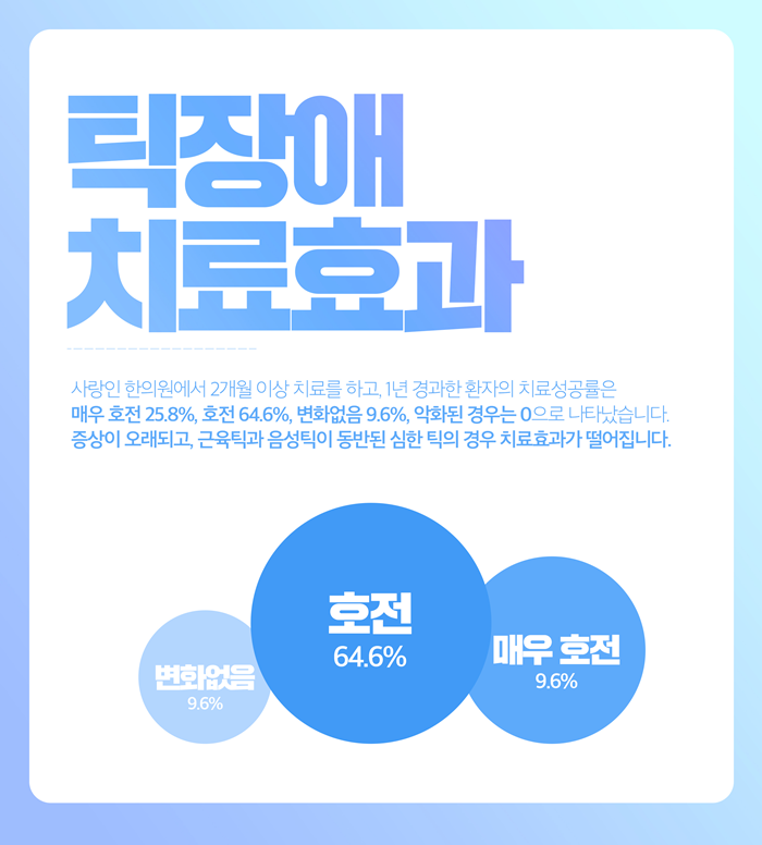 치료 가능한 질환이며 안산 틱장애 한의원 한방치료가 틱 증상 개선에 효과적입니다. 근육틱과 음성틱이 동반된 심한 틱의 경우에는 치료 효과가 다소 떨어질 수 있습니다. 틱 증상이 만성화될수록 뇌의 신경 회로가 굳어지고 다른 심리적 문제가 동반될 가능성이 높아지기 때문입니다.