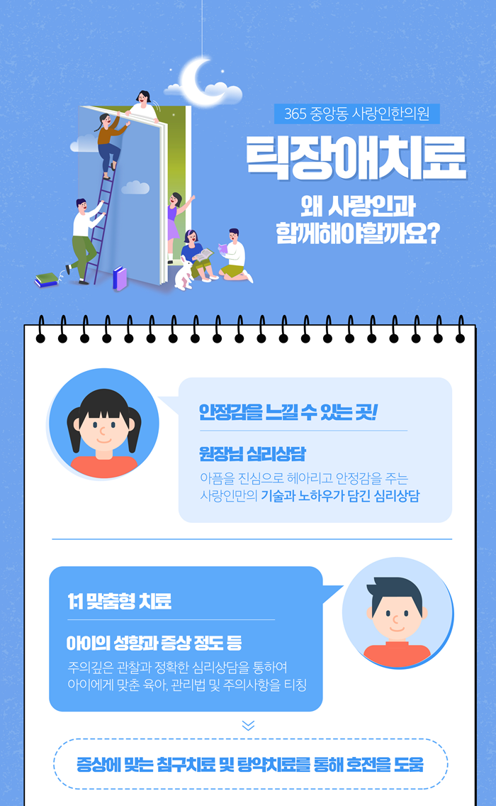 아이들의 건강은 예측할 수 없는 순간에 문제가 발생할 수 있습니다. 부모님의 마음을 헤아려 언제든 편안하게 진료를 받으실 수 있도록 노력하고 있습니다. 틱장애는 주로 5세에서 7세 사이에 시작되는 경우가 많으며 의지와는 상관없이 목적 없이 빠르고 반복적인 행동을 하거나 소리를 내는 질환입니다. 틱장애는 크게 근육틱장애와 음성틱장애 두 가지 주요 유형으로 나눌 수 있습니다.