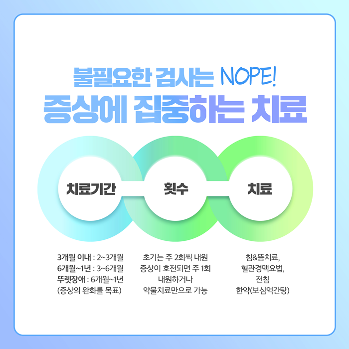 1년 이상 지속되는 경우 더 장기간의 치료가 필요합니다. 이 경우 증상의 완전한 소실보다는 증상의 완화와 관리를 목표로 하며 일상생활에 지장 없이 생활할 수 있도록 돕는 데 중점을 둡니다. 증상이 심하거나 치료 초기에는 주 2회 내원을 권합니다. 이 시기에는 내원 치료를 통해 뇌와 신체의 균형을 빠르게 잡는 데 주력합니다.