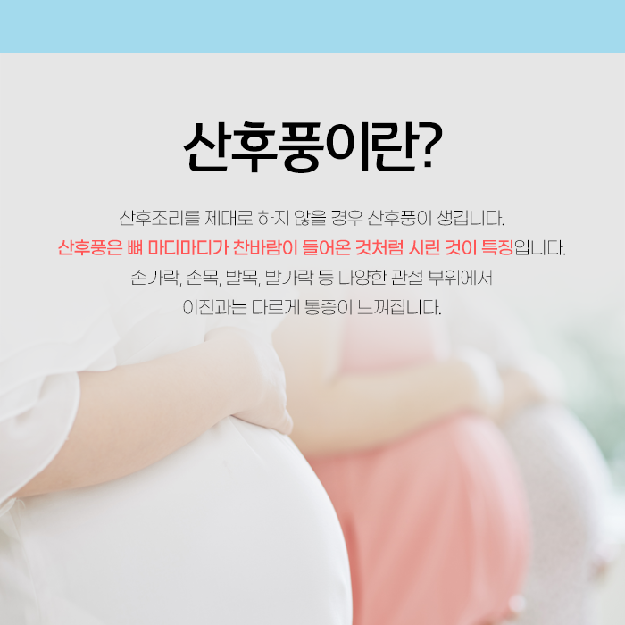 산후풍은 제때 관리하지 않을 경우 오랜시간 힘들어할 수 있기 때문에 시기에 맞춰 치료받는게 중요할 수 있습니다. 산후풍은 전신 관절에서 쑤심, 저림 등의 통증을 호소하거나 몸이 으슬으슬하고 시린 느낌, 피로감, 두통, 소화불량 등 다양한 증상을 유발합니다.