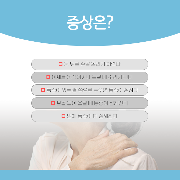 전형적인 증상으로는 팔을 위로 올릴 때 심한 통증이 나타나며 어깨를 움직일 때마다 소리가 나거나 걸리는 듯한 느낌을 받을 수 있습니다. 건강한 어깨는 충분한 여유 공간이 있어 팔을 자유롭게 움직일 수 있습니다.