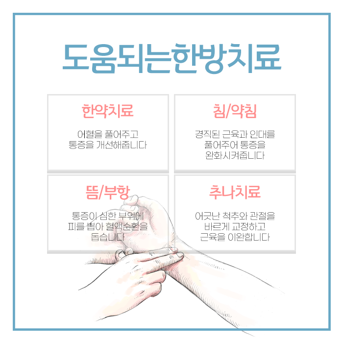 침치료는 굳어진 근육, 통증 부위을 찾아 몸의 회복 능력을 활성화합니다. 약침치료는 염증을 줄이고 통증 감소에 효과를 발휘하며 손상된 조직의 재생을 촉진하는 데 효과적입니다. 뜸치료는 온기를 전달하여 혈액 순환을 촉진하고 냉기를 제거하며 통증을 완화하고 몸의 면역력을 높입니다.