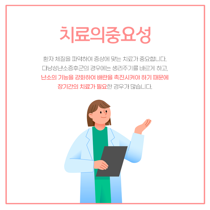 미성숙 난포들이 정상적인 배란이 방해합니다. 생리불순으로 치부하며 치료하지 않고 방치하게 되면 임신을 계획할 때 난임으로 이어질 가능성이 크게 높아지므로 되도록 빠른 시일 내에 치료해야합니다.