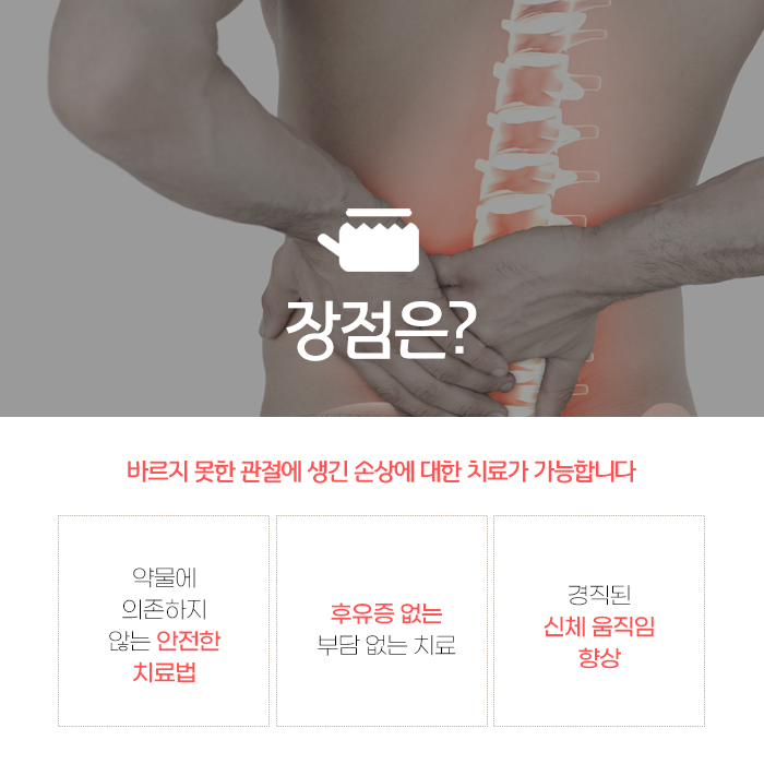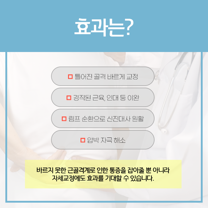 무엇보다 비교적 안전하고 부작용이 적다는 장점이 있지만 손기술이 전제되어야 합니다. 적용 영역은 넓습니다. 디스크성 통증이나 척추관협착증으로 인한 자세 불편과 보행 시 피로, 어깨 질환, 골반 불균형에서 비롯된 통증, 장기간의 잘못된 자세로 생긴 근막통 등에서 통증 완화와 기능 회복, 재발 방지할 수 있습니다.