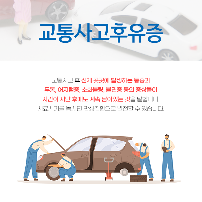 교통사고 후유증은 초기에 적극적으로 대처하는 것이 중요합니다. 지연될수록 안산 야간진료 한의원 치료가 어렵고 복잡해지며 장기적으로 고통받을 수 있습니다. 사고 크기와 관계없이 몸이 받는 충격의 양상은 예측할 수 없습니다.