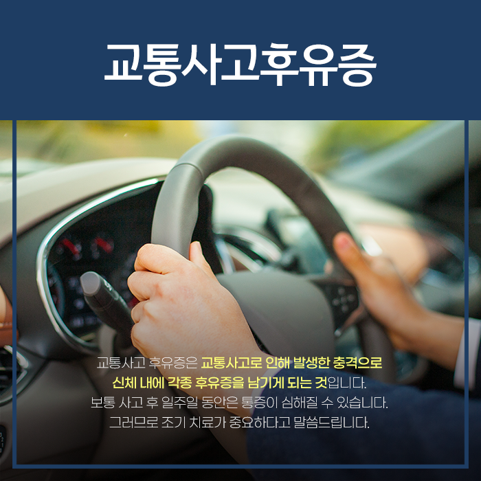 이를 위해서는 사고 직후 정확한 검진과 치료를 받는 것이 바람직합니다. 후유증은 외관상 눈에 보이는 증상뿐만 아니라 정신적으로 다양한 양상으로 나타날 수 있습니다.