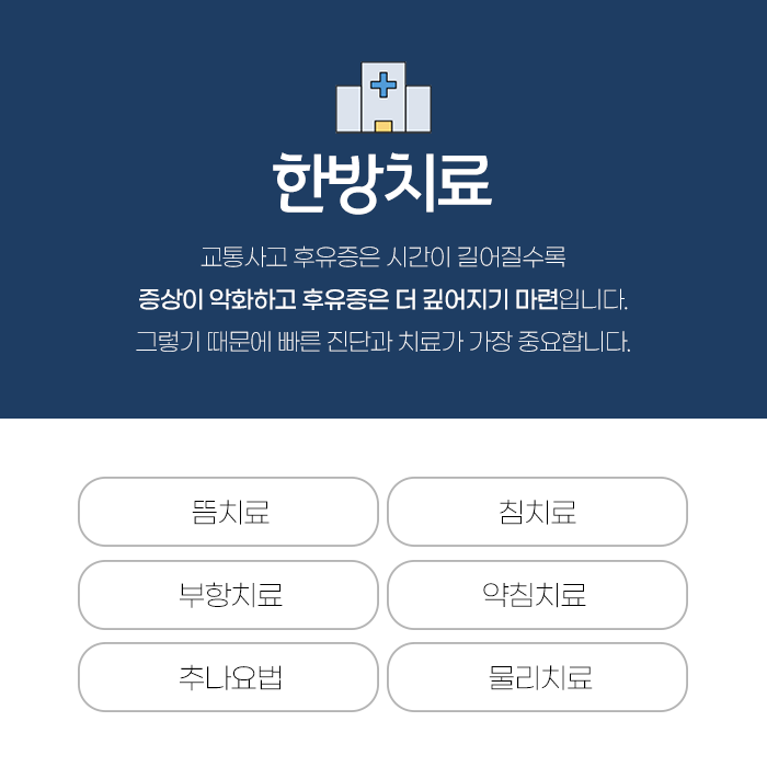 증상과 상태에 따라 한방치료법을 함께 적용하면 효과를 내어 회복 속도를 높이고 사고로 인한 신체 기능 저하와 염증을 효과적으로 줄이는 데 도움을 줍니다. 눈에 보이지 않는 내부 손상과 척추 변형까지도 고려하여 조기 치료를 시작하는 것이 중요합니다.