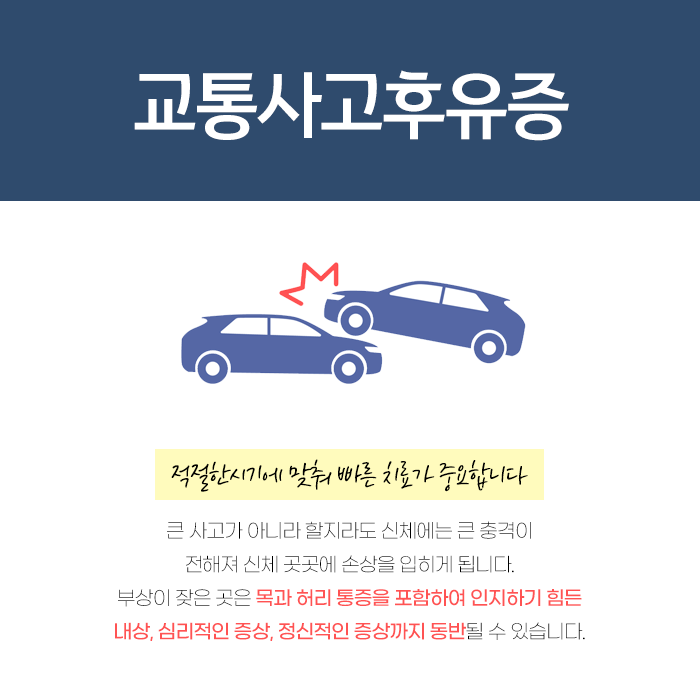 체질과 증상에 맞춘 안산 중앙동 한의원 한약처방, 침치료, 약침치료, 추나요법 등의 다양한 치료가 병행됩니다. 교통사고 후 긴 시간 누적된 복합적인 후유증을 효과적으로 완화시키고 통증뿐만 아니라 신경계와 내장 기능까지 회복시켜 건강 증진에 도움이 됩니다. 교통사고 후 조금이라도 이상 증상이 지속된다면 치료를 받으시길바랍니다. 감사합니다.