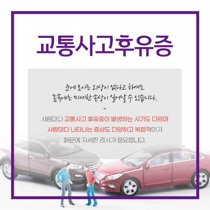운전을 하는 분들께서는 언제나 안전운전을 위해 최선을 다하시지만 주변 요인으로 인해 교통사고를 겪는 경우가 발생합니다. 대형사고에서 부상이 심해 치료를 받지만 외관상 큰 상처가 없거나 눈에 띄지 않는 경우에는 건강 상태를 꼼꼼히 살피지 않고 다른 일에 집중하는 분들도 많습니다.