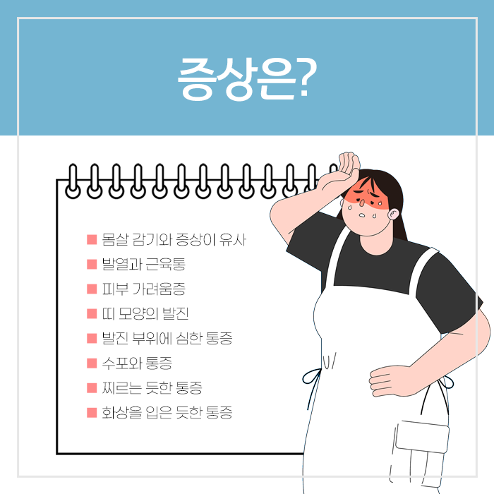 하지만 실제 대상포진은 피부 질환이 아니라 신경을 따라 염증과 손상을 일으키는 신경 질환입니다. 피부에 발진으로 명확하게 나타나기 며칠 전부터 몸에 알 수 없는 증상이 나타날 수 있습니다. 몸살 느낌과 미열, 가벼운 근육통이나 으슬으슬한 느낌 등이 나타나기 시작합니다.