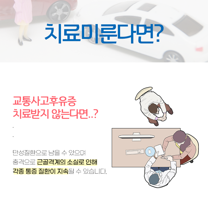 불편한 증상들을 방치한다면 증상이 더욱 악화되어 치료 기간이 길어지고 회복이 더뎌질 수 있으므로 문제가 커지기 전에 빠른 시일 내에 치료받으시길바랍니다. 개인의 체질, 사고의 종류와 경중, 건강 상태, 생활습관에 따라 증상 발현 양상과 회복 속도가 다릅니다.