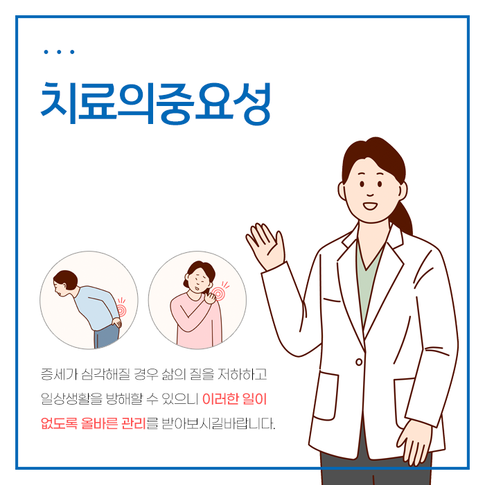 통증이 누적되면 두통, 피로, 고혈압 등을 유발할 수 있습니다. 작은 외부 충격에도 불구하고 상당한 수준의 손상으로 발전할 가능성이 있습니다. 증상들이 만성적인 상태로 악화될 경우, 치료 과정이 한층 더 복잡해질 수 있기에 지체 없는 신속한 처치와 안산 교통사고 입원 진료를 서둘러야합니다.