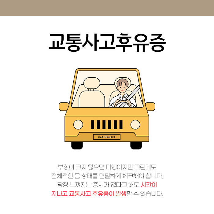 사고 충격은 단지 물리적인 통증만을 남기는 것이 아닙니다. 정신적 불안정, 초조한 감정, 작은 일에도 크게 반응하는 과민 반응, 주의력 분산, 밤에 잠들기 어려운 수면 장애 등 심리적인 증상들이 동반될 수 있으니 안심해서는 안 됩니다.