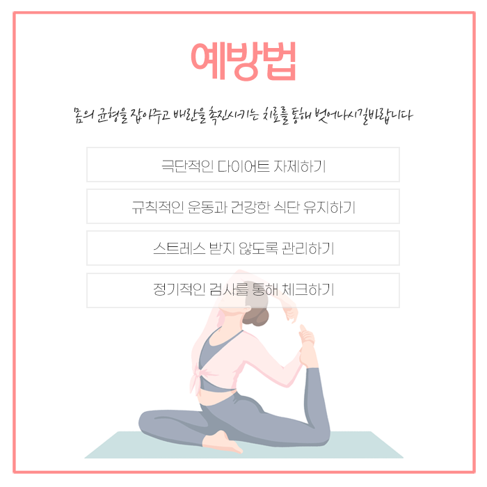 안산 다낭성난소증후군 증세를 소홀히 여기고 치료 시기를 놓치면 자칫 난임이나 불임의 위험성이 커질 수 있을 뿐만 아니라 여성 건강의 균형이 깨질 수 있습니다. 치료와 함께 건강한 몸 상태가 지속적으로 유지될 수 있도록 규칙적인 식사, 적절한 운동, 스트레스 관리, 충분한 수면 등 건강한 생활 습관을 통해 재발을 방지하고 꾸준히 건강을 유지하실 수 있도록하는 것이 중요합니다. 감사합니다.