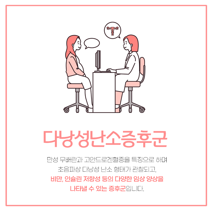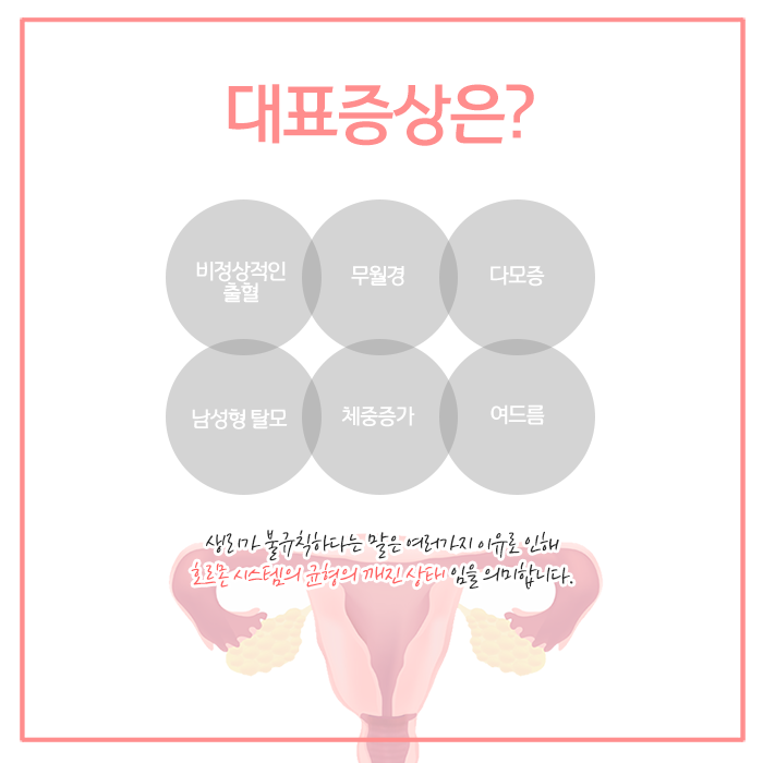 불규칙한 배란이 가장 큰 특징이기 때문에 현재 임신을 준비하고 계신 분들이라면 훨씬 더 신속한 케어가 요구됩니다. 현재 생리를 하지 않거나 평소와 다른 부정출혈, 머리숱이 적어지고 몸에 털이 많아지는 경우, 급격한 체중 증가 등을 겪고 계시다면 다낭성난소증후군 진단을 위해 진찰을 받아보시는 것이 중요합니다. 여성 호르몬 불균형으로 인해 배란 장애와 함께 여러가지 증상을 동반하는 복합적인 질환입니다.