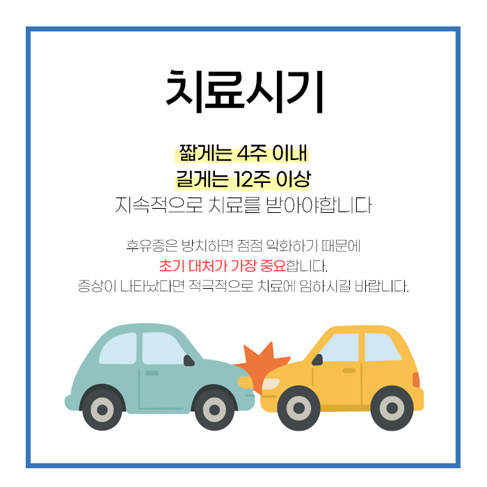 모든 질병에는 골든타임이 존재하듯이 교통사고 후유증 역시 적정 시점이 있습니다. 이 시기를 놓치면 치료가 더 어려워지고 복잡해질 수 있다는 점을 기억해야합니다.