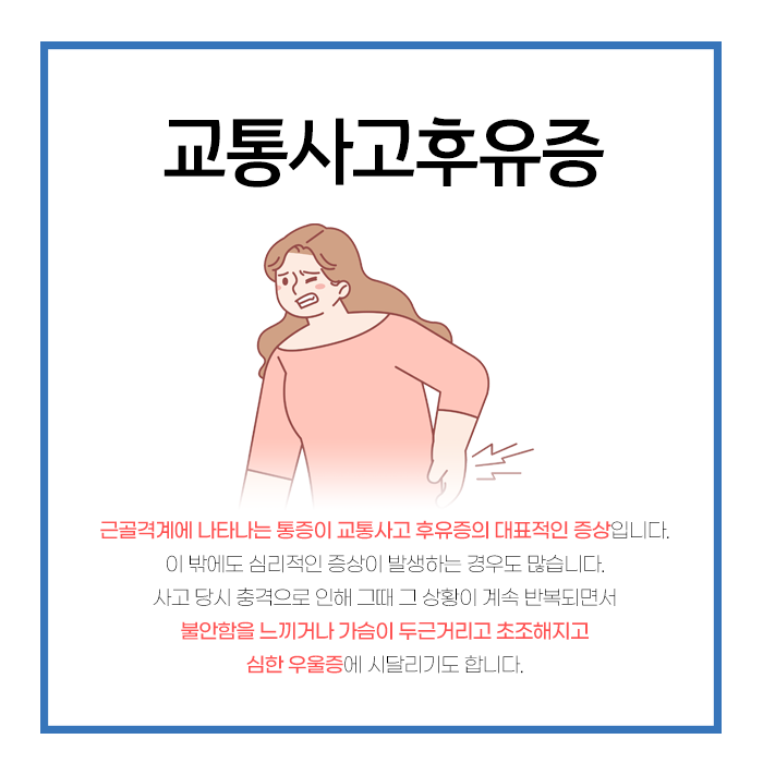 불의의 사태가 발생했을 때 현장을 정리하는 것도 중요하지만 그에 못지않게 몸과 마음의 건강을 살피는 것이 중요합니다. 교통사고는 겉으로 보이는 상처가 전부가 아닐 수 있습니다.