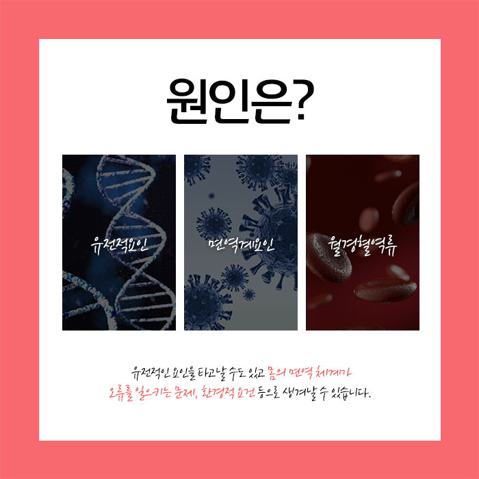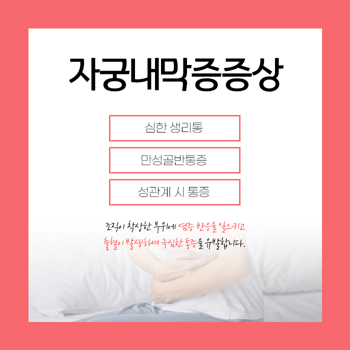 여성 호르몬의 영향을 받아 나타나는 자궁내막증은 초기에는 자각하기 힘든 영역에 조용히 자라면서 자궁 내벽 조직이 비정상적으로 두텁게 쌓이거나 증식되는 형태로 진행되곤합니다. 자궁과 연관된 질병들은 감기처럼 한번 걸리면 재발할 가능성이 높은 특성이 있습니다.