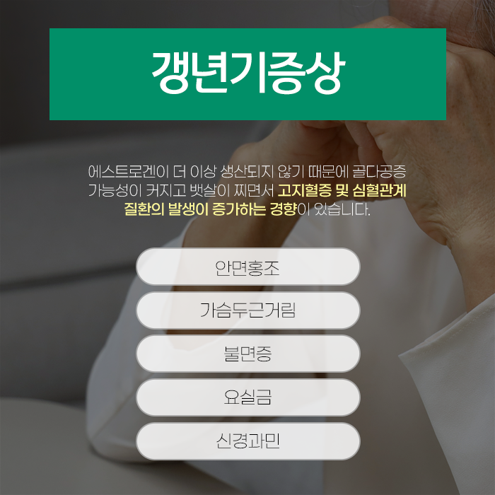 갱년기는 노화의 한 과정이라기보다는 몸의 호르몬 변화가 전반에 막대한 영향을 미치는 시기입니다. 얼굴 붉어짐과 몸 위쪽 땀 흘림의 횟수가 늘어나고 심해집니다. 불면증이 심해지거나 만성 피로가 쌓이게 됩니다.