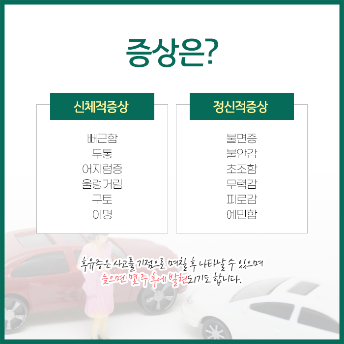 사고 당시에는 차량이 심하게 부딪히지도 않았고 불편함을 느끼지 못하지만 며칠이 지나면서 몸에 변화가 찾아옵니다. 며칠이 지나면서 목이 뻐근해지고 일주일 정도 지나면 숨겨져 있던 통증이 드러나는 것입니다. 기상할 때마다 신체가 무겁고 뻣뻣하며 운전대를 잡기도 힘들 정도로 불편함을 호소하시는 경우가 대표적입니다.