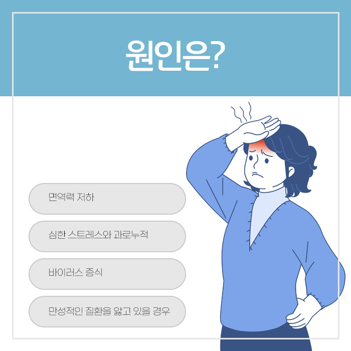 대상포진은 불규칙한 생활습관과 연관이 있습니다. 몸 속에 잠복해 있던 수두 바이러스가 재활성화되며 발생할 수 있습니다. 대상포진은 겉으로는 피부에 발진과 수포가 생기는 피부 질환으로 보이나 신경을 따라 바이러스가 활성화되는 신경계 질환입니다.
