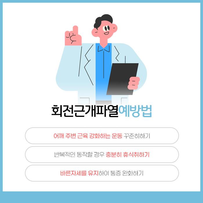 어깨 통증이 시간이 지나면서 점점 심해지거나 특정 움직임에서 찌르는 듯한 통증, 욱신거려 잠에서 깨는 등의 증상이 나타난다면 회전근개파열을 의심해볼 필요가 있습니다. 회전근개는 어깨 관절을 안정시키고 움직임을 돕는 네 개의 근육과 힘줄을 의미하며 이 부위 파열 시 팔을 들거나 돌리는 것이 어렵거나 통증을 유발할 수 있습니다.