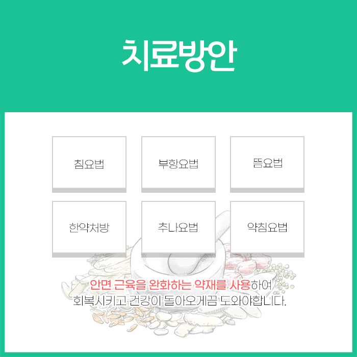 환자의 증상과 체질 등을 진단하여 개인별 한약을 조제합니다. 한약은 근육 이완, 혈액 순환 개선에 중점을 두며 기와 혈의 조화를 통하여 신경계의 흥분을 완화하고 신체 균형을 되찾는 데 효과적입니다.