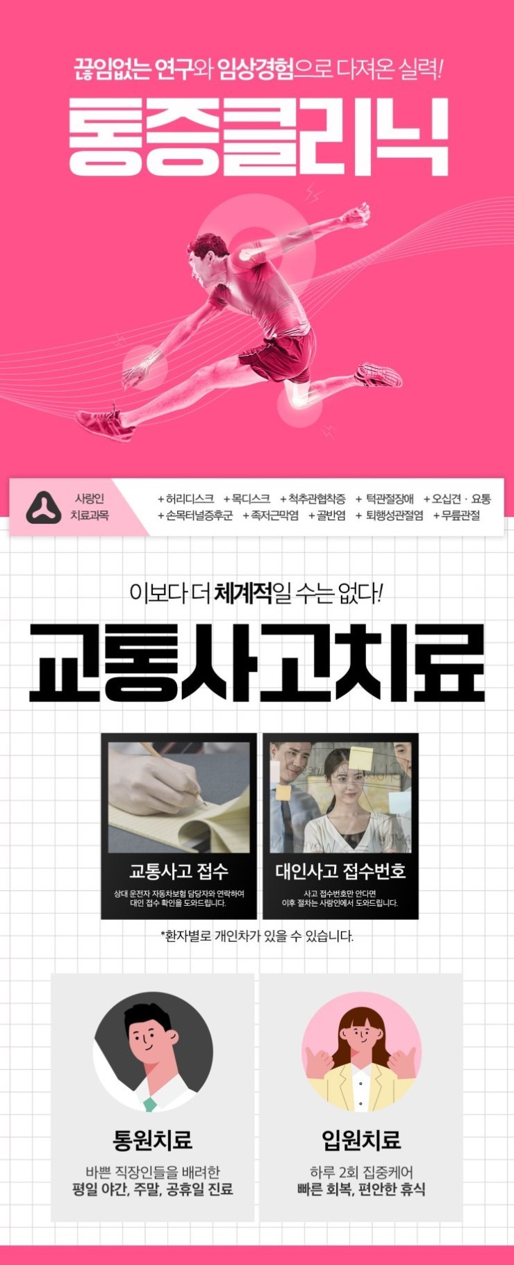 교통사고로 인한 손상은 초기에 적극적인 치료가 핵심입니다. 언제 치료 받는지에 따라 예후는 달라지기 때문인데요. 후유증으로 고통을 받았다면 언제든지 본원의 도움도 받아보세요. 개인에 따라 손상을 개선하여서 후유증 예방을 합니다. 물리치료, 침치료, 약침치료, 추나요법 등을 적용해보는데요. 안산 야간진료 통원 치료와 입원 치료 모두 가능하며 입원 치료의 경우 하루 2회 집중 관리를 이룬답니다.