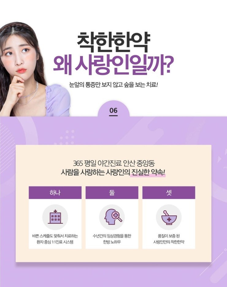 바쁜 직장인 부부를 위해 본 한의원에서는 365일 언제든 문을 열고 있답니다. 평일에는 밤 9시까지 진료하고 평일에는 방문하기 어려우신 분들을 위해 주말, 공휴일에도 진료하고 있습니다. 그렇기 때문에 산후조리 시기에 따라서 올바르게 안산 출산후한약 진행하여 산후풍에 대한 걱정을 덜어보세요.