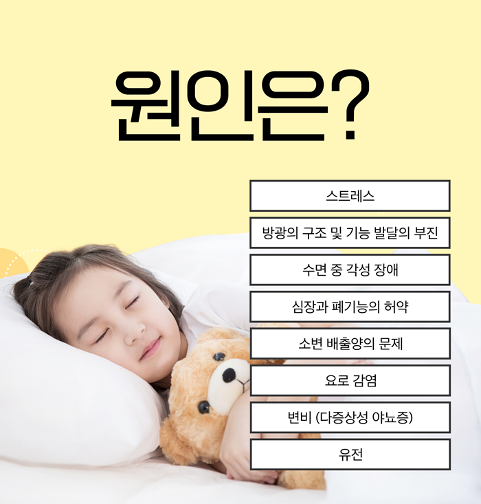 방광의 용적이 충분히 크지 않고 소변이 가득 찼을 때 뇌가 깨어나 소변을 참도록 명령하는 조절 기능이 아직 완전히 성숙하지 않았기 때문에 만 5세 미만의 어린 아이에게서 밤 소변 실수가 나타나는 것은 발달 과정 상 자연스러운 일로 볼 수 있습니다. 이 시기의 야뇨증은 대부분 특별한 치료 없이 시간이 지나면서 자연스럽게 좋아지므로 크게 염려하지 않으셔도 됩니다.